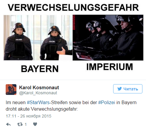 Волну шуток со стороны немецкой общественности вызвала новая форма полиции ФРГ, призванная защитить стражей порядка от тяжелого оружия. "Полиция Баварии рискует быть принятой за героев новой части "Звездных войн", - острят в соцсетях немцы.